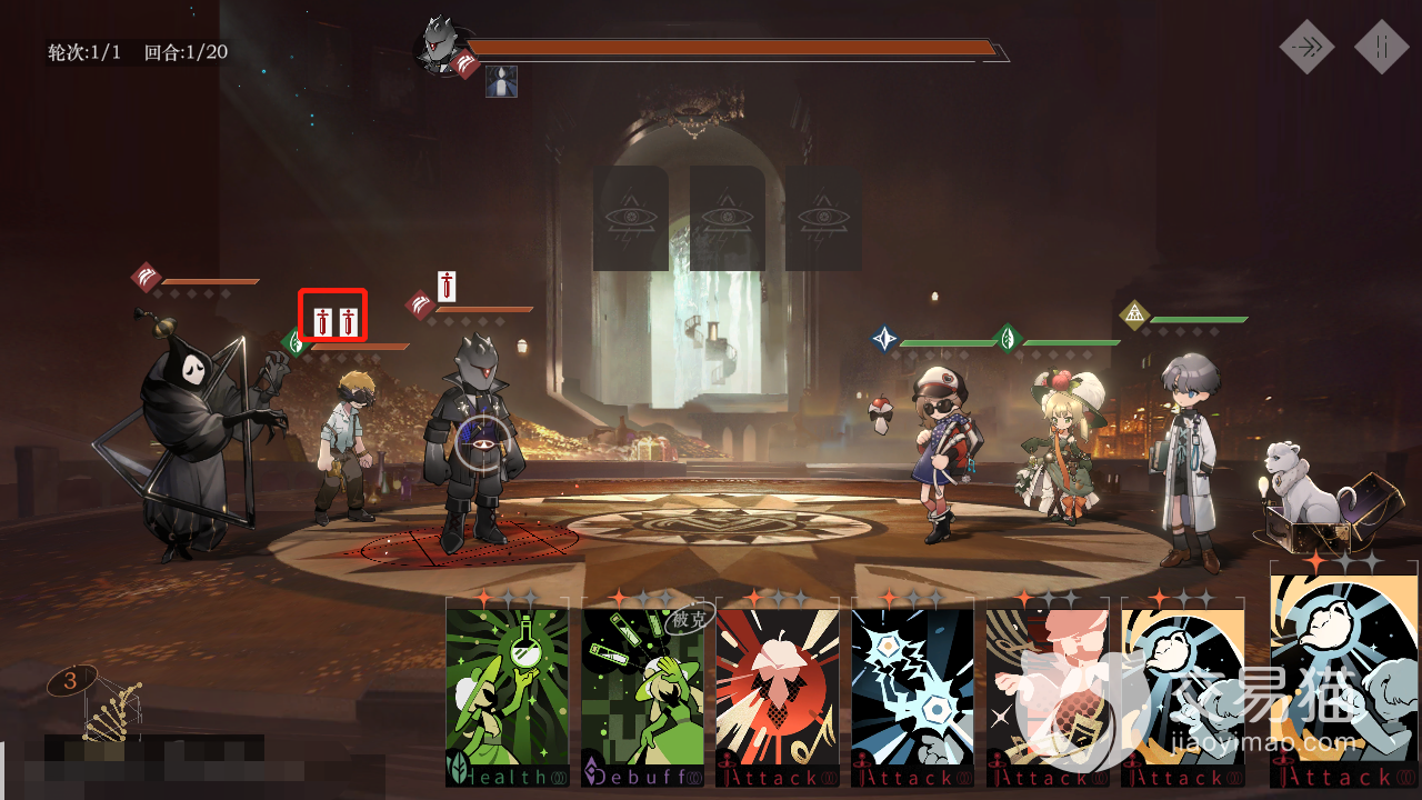 在实战过程中,如果发现有难打的敌人,可以尝试使用一下两个技巧,第一个技巧是观察敌人头顶上的图标,如果出现下图这种红色剑刃标志的图标,那么则代表下回合它将会发动攻击型技能,此时如果己方有虚弱或者缴械效果的技能可以直接使用,这样能够让他们的伤害变低,从而保障己方的血线健康,以此提高胜算。