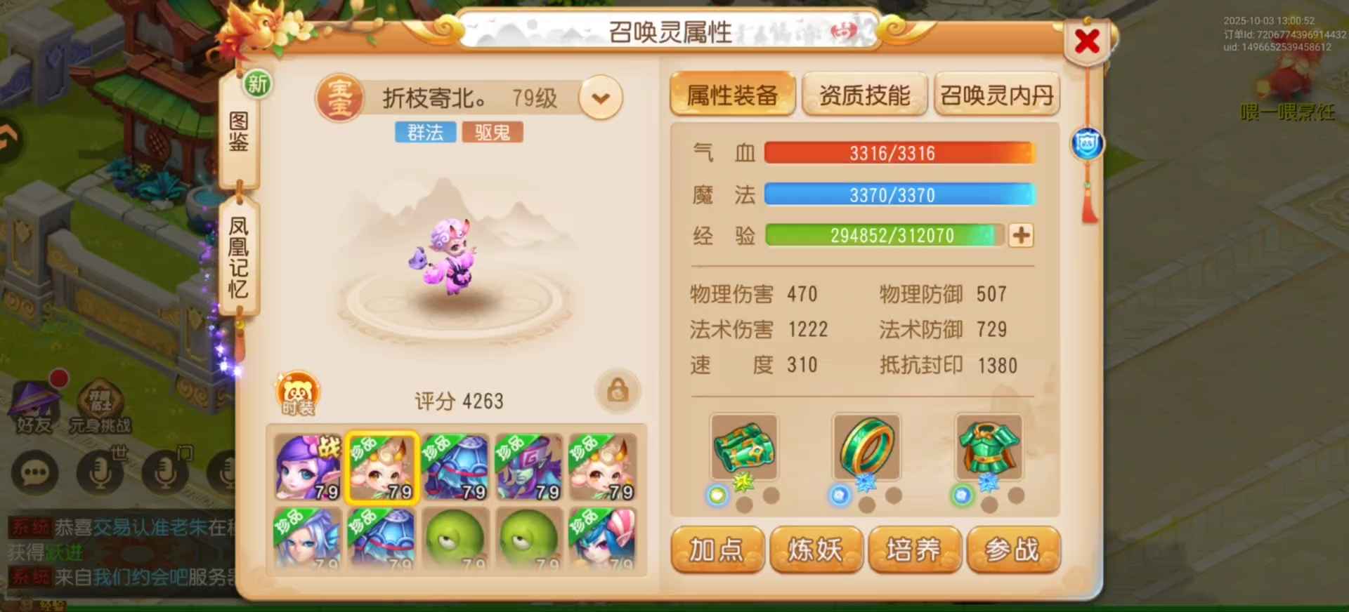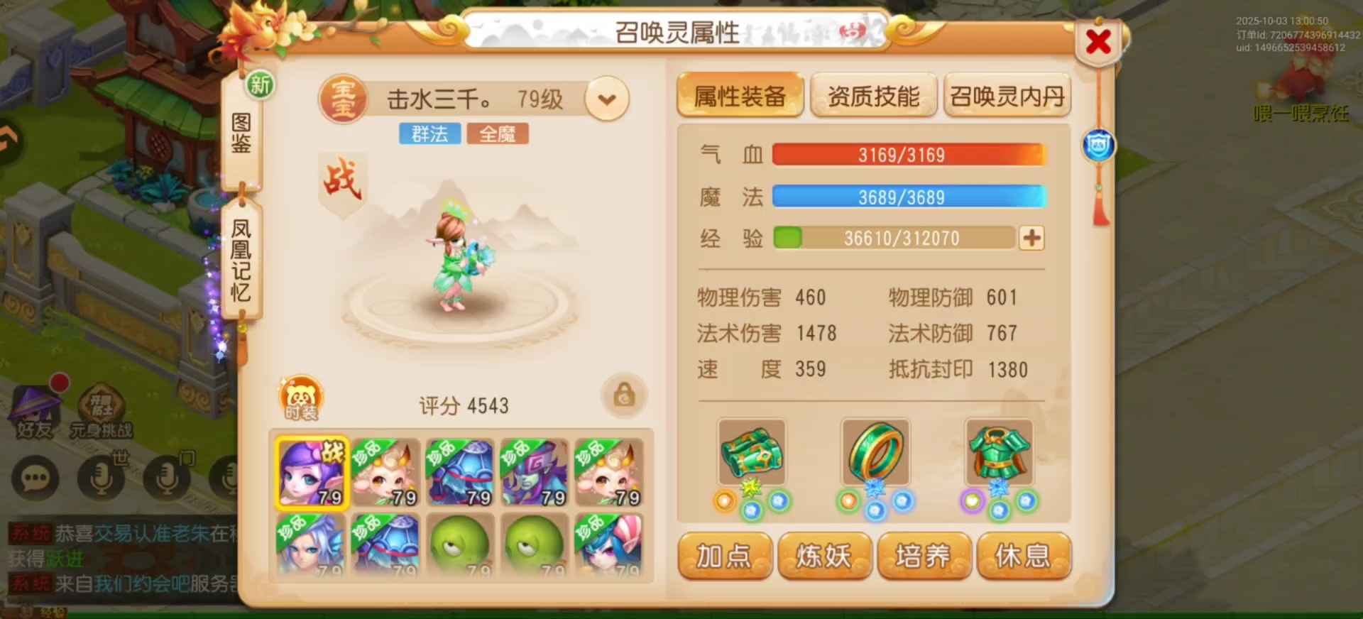 边玩边出 细节号 满符1730法伤 1350防御 9全红宠物 法宝基本全满 装备全满熔炼