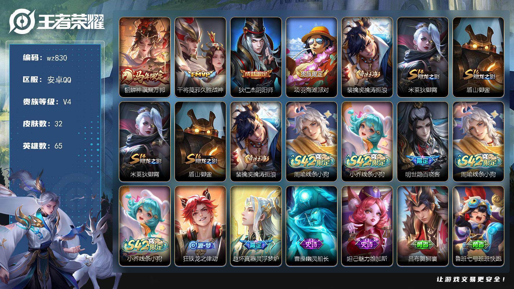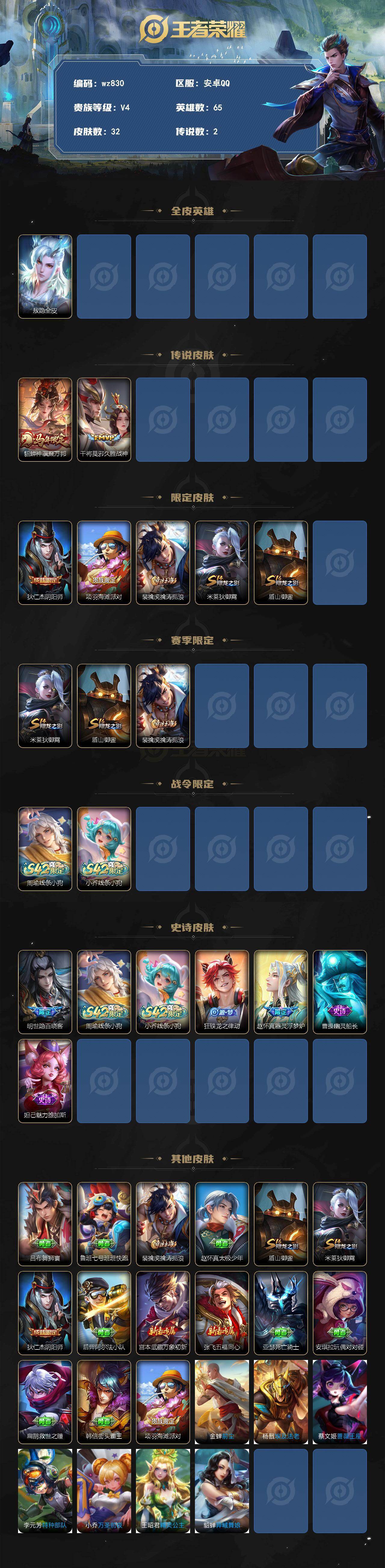 安卓Q-V4-尊贵铂金IV段位-65英雄-32皮肤-2传说-6史诗