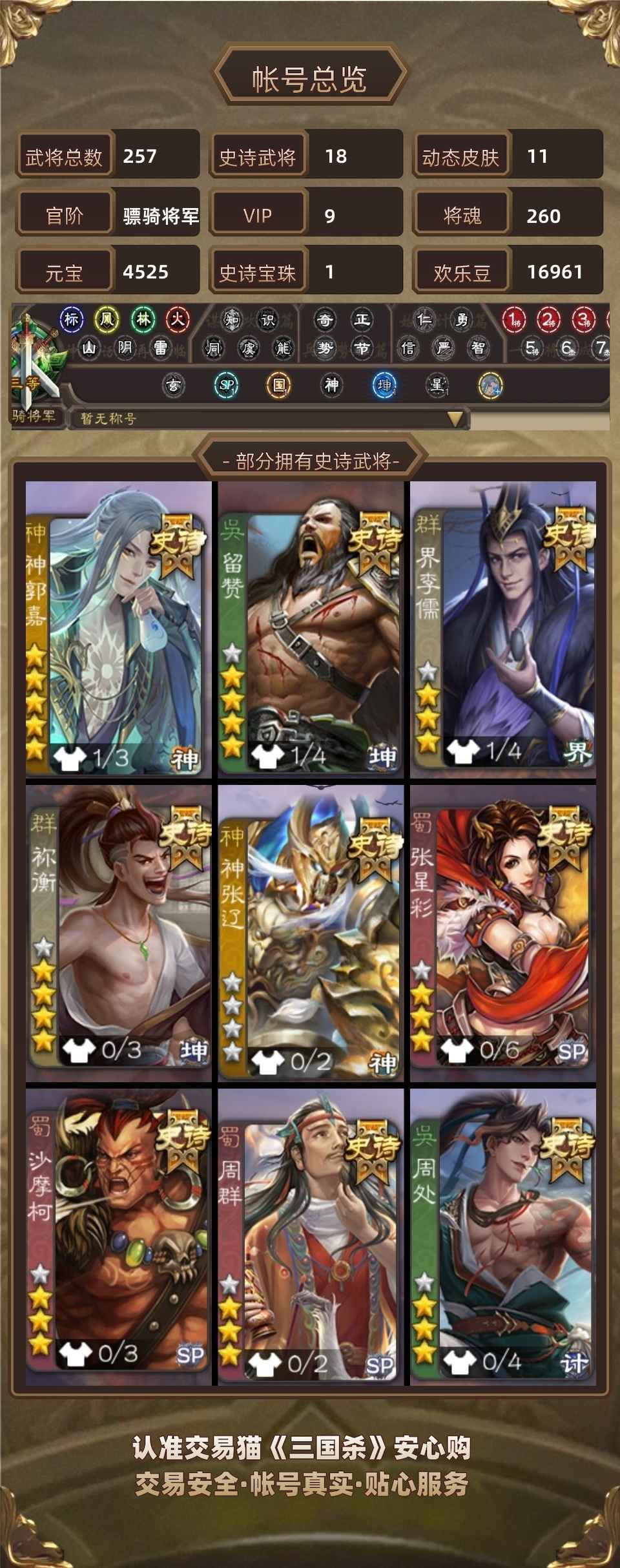!炎龙动神郭嘉+玉龙动留赞+玉龙祢衡+玉龙星甘宁+界李儒周处神张辽等18史诗骠骑号!郭嘉不才一轮十牌,歌王ak突突突!可某yu牛哥手杀更加实惠哦 !排位72将 多精品 牵招 杨祜 胡班 崔琰 界满宠等 !6级树带4000多元宝+豆票2.8万+宝珠一颗