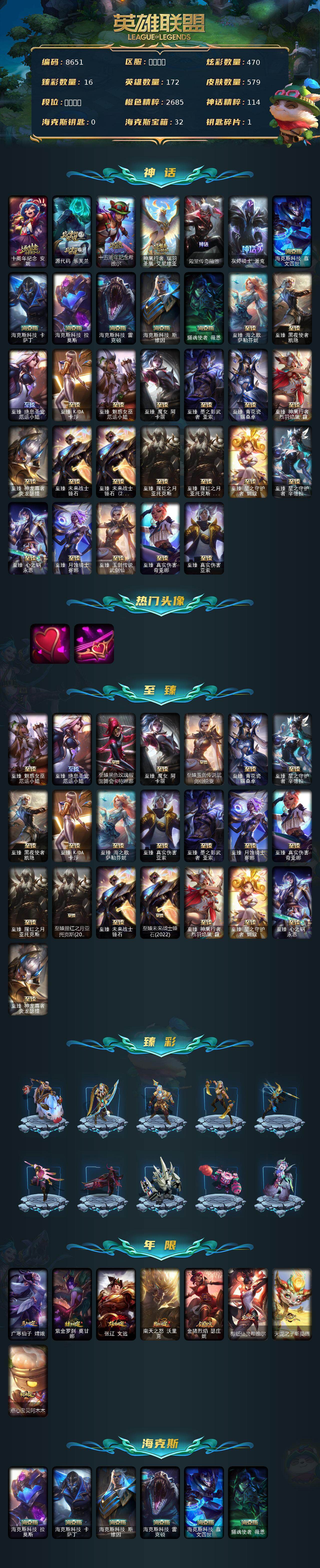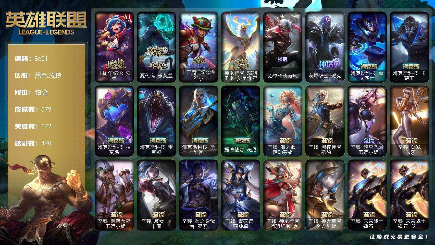 5把匹配打排位-单双铂金段位-172英雄-579皮肤-470炫彩-1终极-34神话-83限定-66传说-120史诗