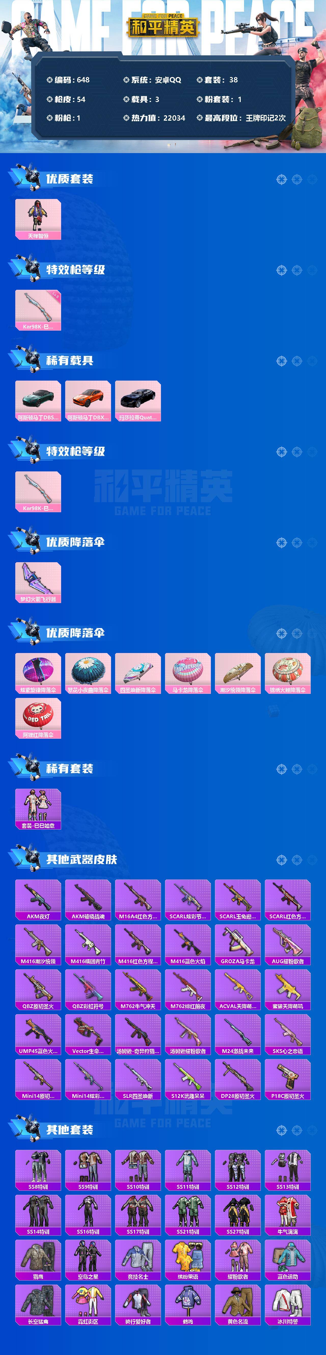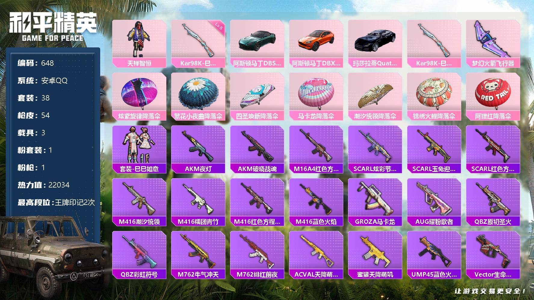 编号83242 不可二次 等级51 30套装 47枪皮 历史最高王牌12金星 6王牌印记 热力值16943 2载具 3粉 1特效枪 玛莎拉蒂Ghibli(粉) 兰博基尼AventadorSVJ(翡翠绿) 4级M416-心之恋语 沙场疾风 炙焰赤龙 翡翠骑士 暖风夏荷 套装-呆萌铁蟹 套装-青春冒险家 AUG青春冒险家 M24香水柠檬 Vector风花雪月 M249星之彼岸 2粉降落伞