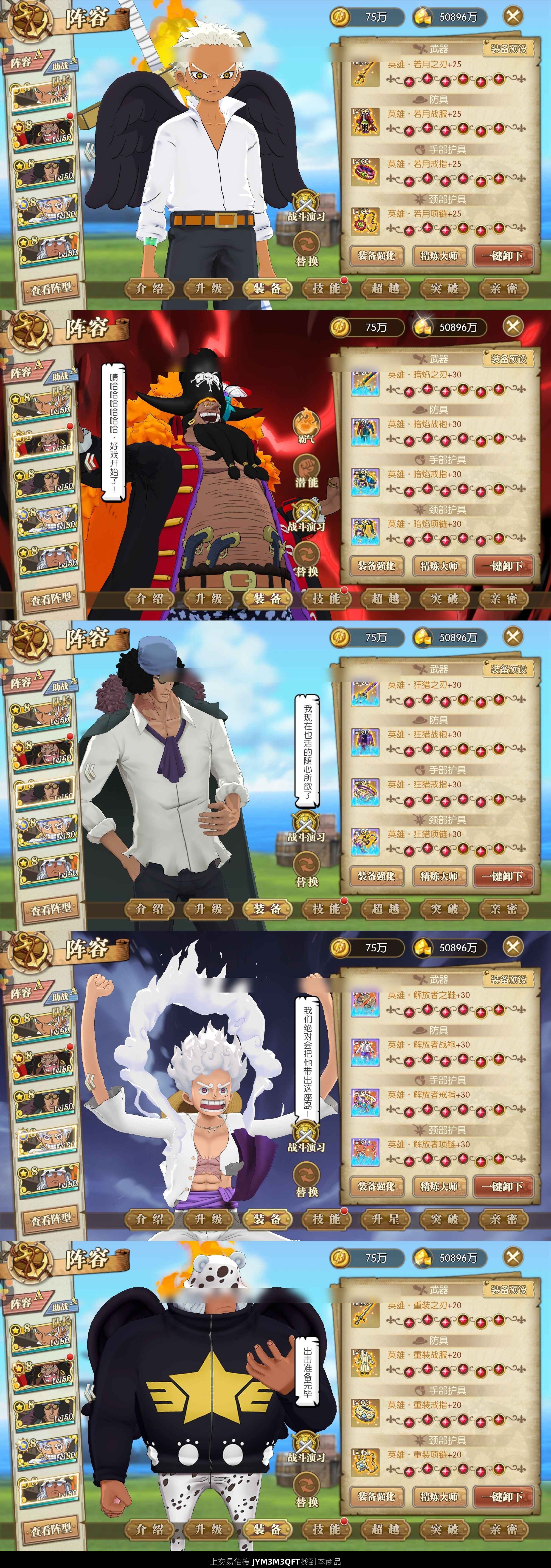 三套共振,若月99-98-98-100,资源均有,4套12普通速度,7个11迅捷,10个10级迅捷,百兽团皮肤均有,争霸大师稳进,尾区无压力,3艘船均有速度,六级速击阵 有龙凯助威,有青龙,命运,海贼王,迅捷,武装,复仇套装!