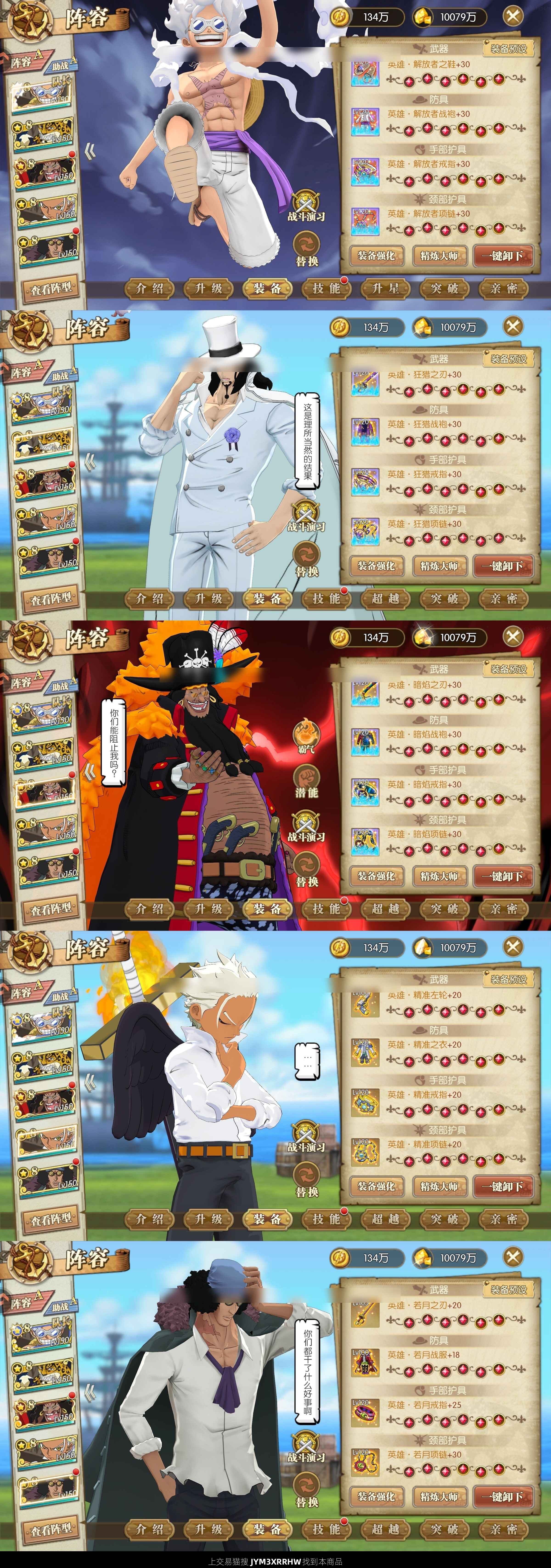5时装8星尼卡,8星罗杰,8星龙凯 3觉醒3灾人兽时装 阵法马上+5速 3套共振,若月戒指1共鸣,项链全共鸣 310UR卷,130铸造卷 解放套,海贼套,狂猎套,暗焰套,若月套 精准套,暴走套,屠戮套,复仇套,毁灭套,卓越套 1451速黑胡子,超级洗练还能+几速 不议价,捡漏号,错过没有 转移号,安全