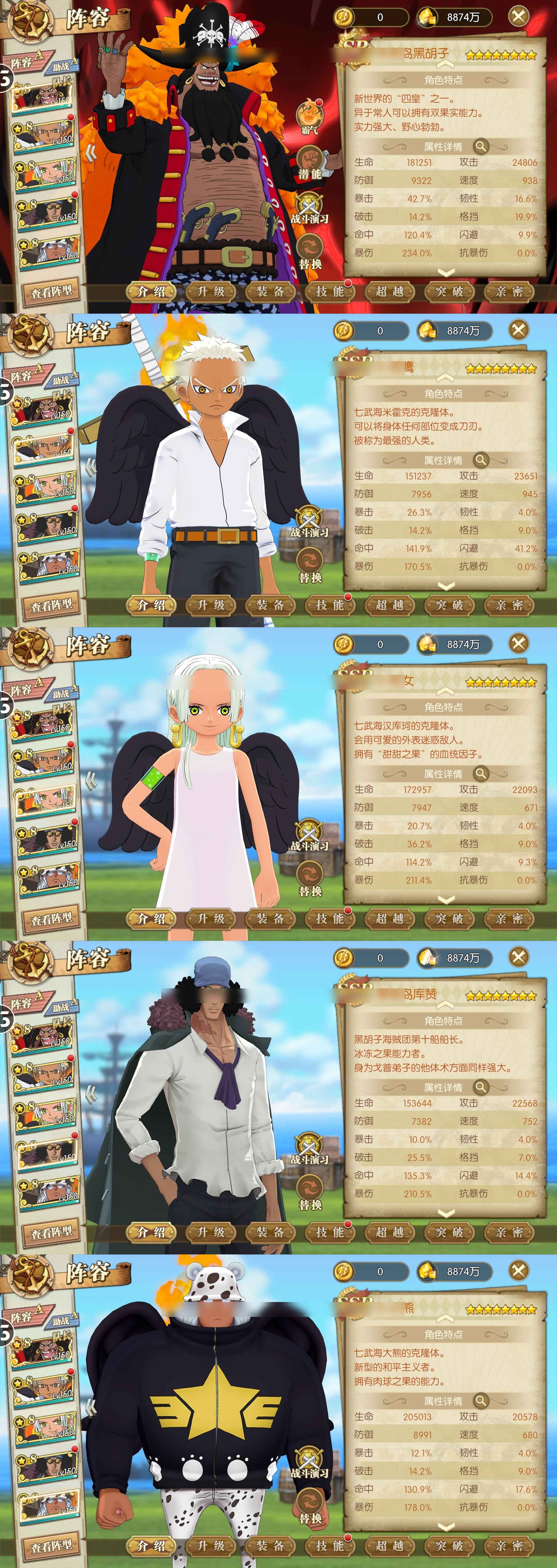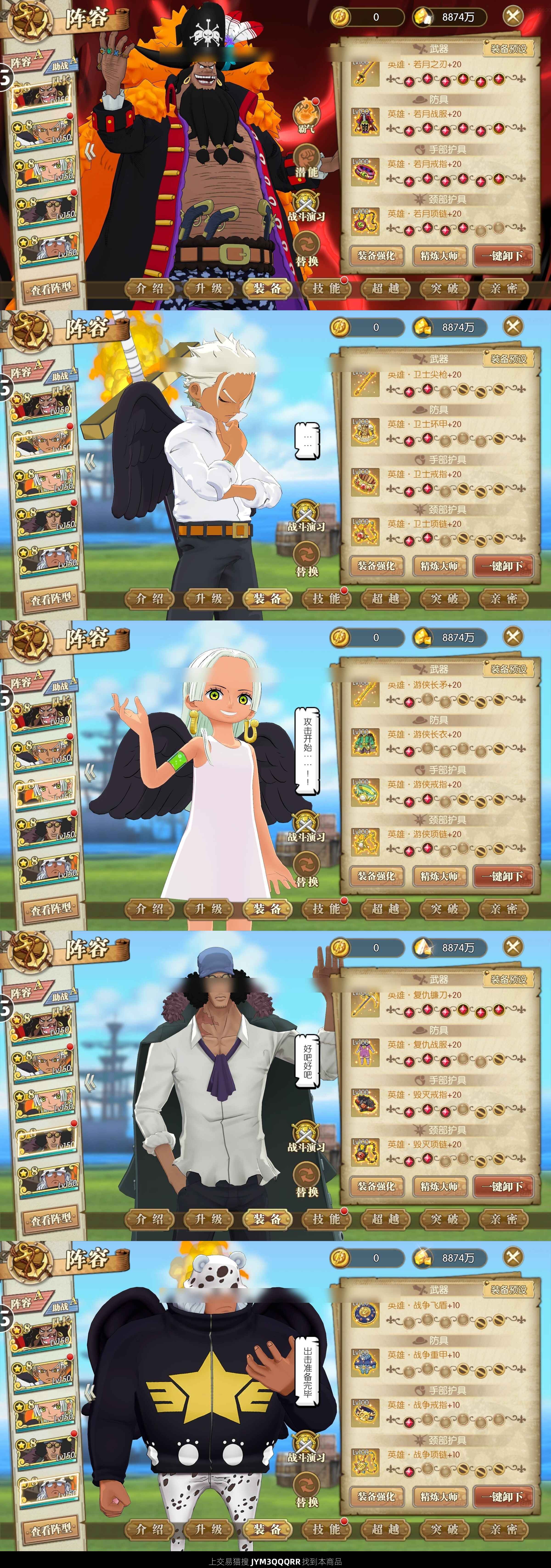 V4,差70V5 未来黑胡子若月一套 8尼卡,8未来黑胡子,8s鹰,8s女帝,8s小熊,8蜂巢岛库赞,8黑色玛利亚,8黄猿,8桃子 三觉锦卫门,二觉先月御殿,可二觉卡普(目前一觉) 1800强者,21847彩钻,10w蓝钻,装备铸造券38,春节好礼任选,装备自选(暴走,精准或者10张装备券),ssr任选