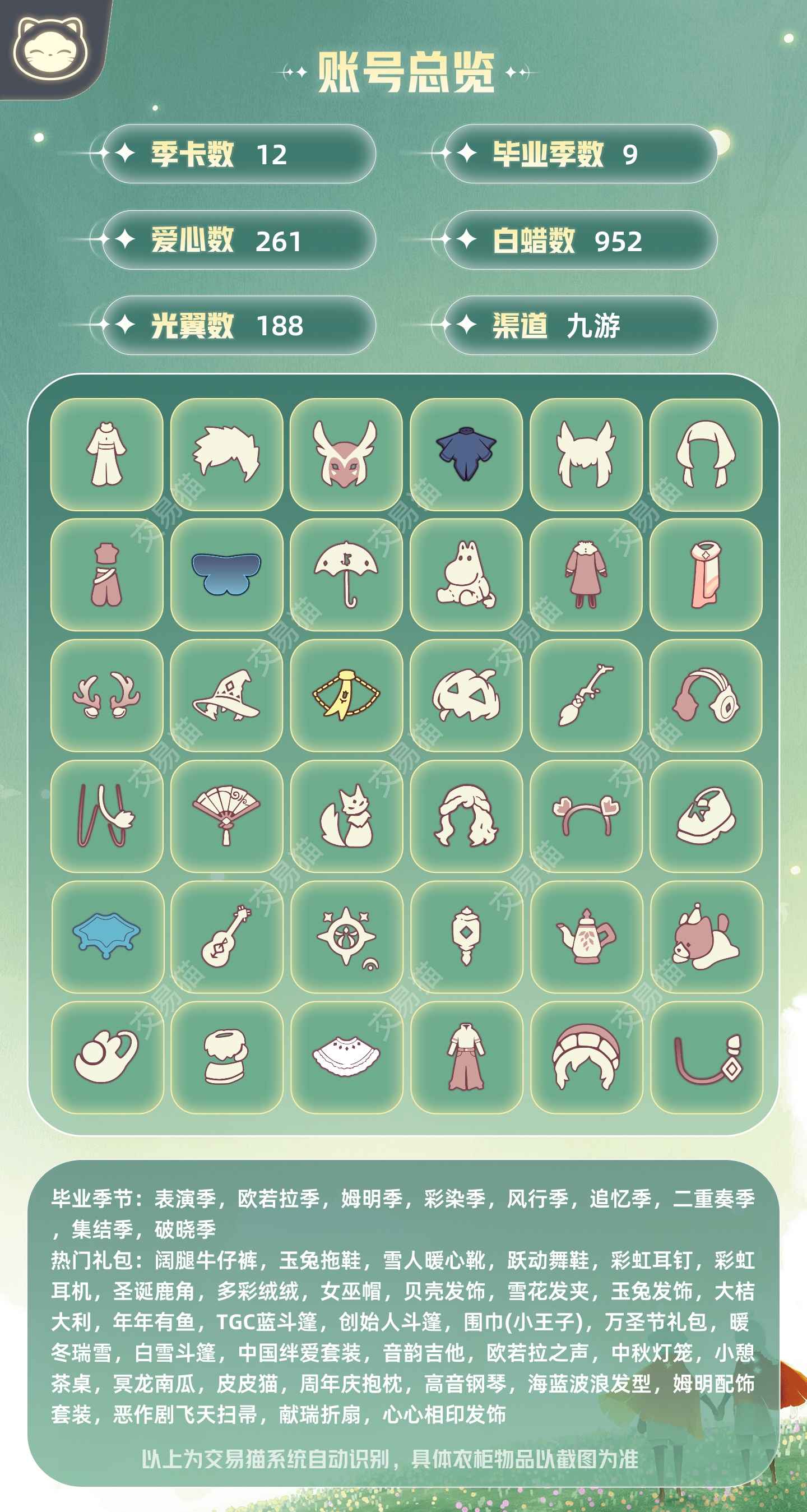 出九游渠道号,全常驻季节,900多蜡烛261颗心,12个季节蝙蝠斗巫师tgc欧若拉雪地靴尾巴耳朵绊爱耳机鹿角彩虹帽南瓜奥利奥等