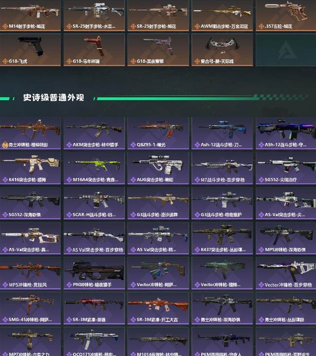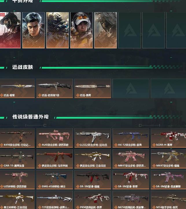 【传说外观】:K416突击步枪-行动记录,AUG突击步枪-悠然茶歇,SG552突击步枪-运动员,AK-12突击步枪-夜鹰,SCAR-H战斗步枪-荼蘼,CAR-15突击步枪-黑鹰坠落,腾龙突击步枪-马年祥瑞,腾龙突击步枪-万金泪冠,MK47突击步枪-悠然茶