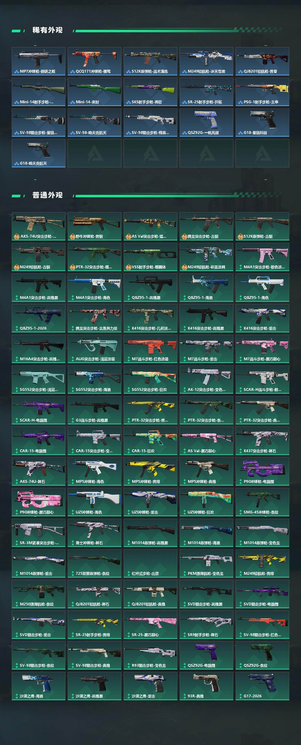 【传说外观】:SG552突击步枪-运动员,SG552突击步枪-点翠,SCAR-H战斗步枪-水墨云图,SCAR-H战斗步枪-启航,腾龙突击步枪-万金泪冠,KC17