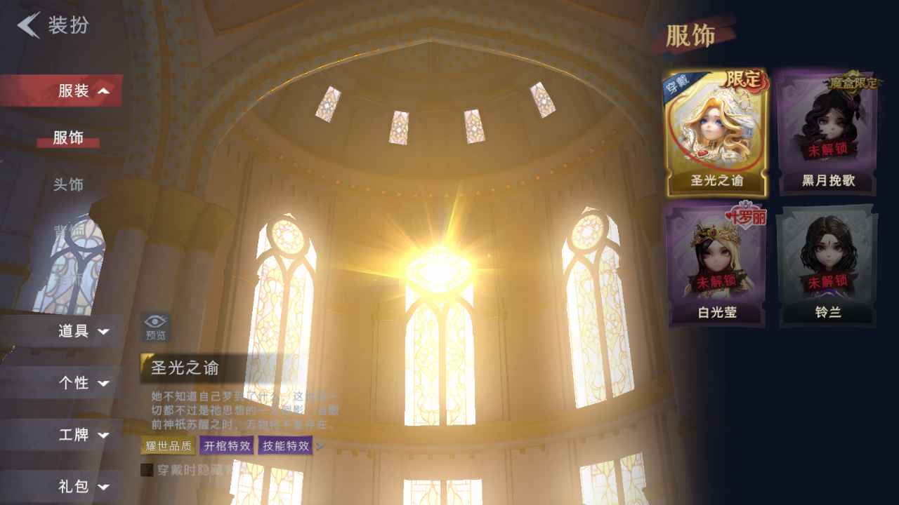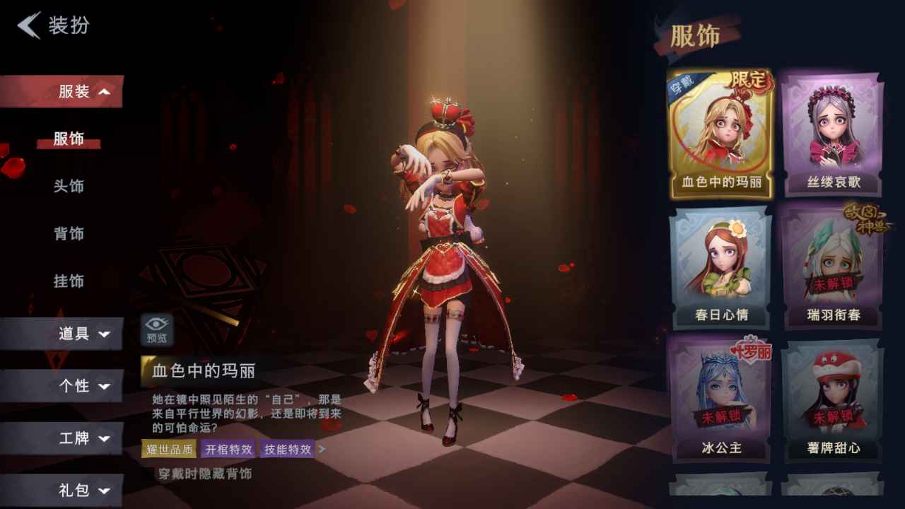员工:小黄 爱丽丝 零 阿念 逍遥 薇薇安 巫铃儿 莉莉 艾伦 爱德华 皮肤:爱丽丝-血色中的玛丽 薇薇安-圣光之谕 小黄-呱呱雨衣 小黄-青丘一梦 爱丽丝-丝缕哀歌 道具:铲子-龙鳞 铲子-圣心之泪 传送按钮-幻宠之门 摸金符-祝祷词 腰包-宝剑八 腰包-绯红柴郡猫 专业手电-云端梦想计划 音响-鸣沙鼓 转轮手枪-新星时代 电击枪-甜蜜泡泡枪 急救包-蔷薇物语