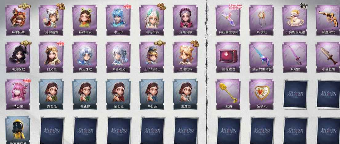 紫色皮肤莉莉-莓果陷阱 薇薇安-黑月挽歌 阿念-王子与骑士 莉莉-情公主 艾伦-水王子 薇薇安-白光莹 阿念-灵昭鹿鸣 爱丽丝-瑞羽衔春 小黄-霓裳踏雪 零-青云逸歌 巫铃儿-素影瑶光 爱丽丝-丝缕哀歌 小黄-呱呱雨衣