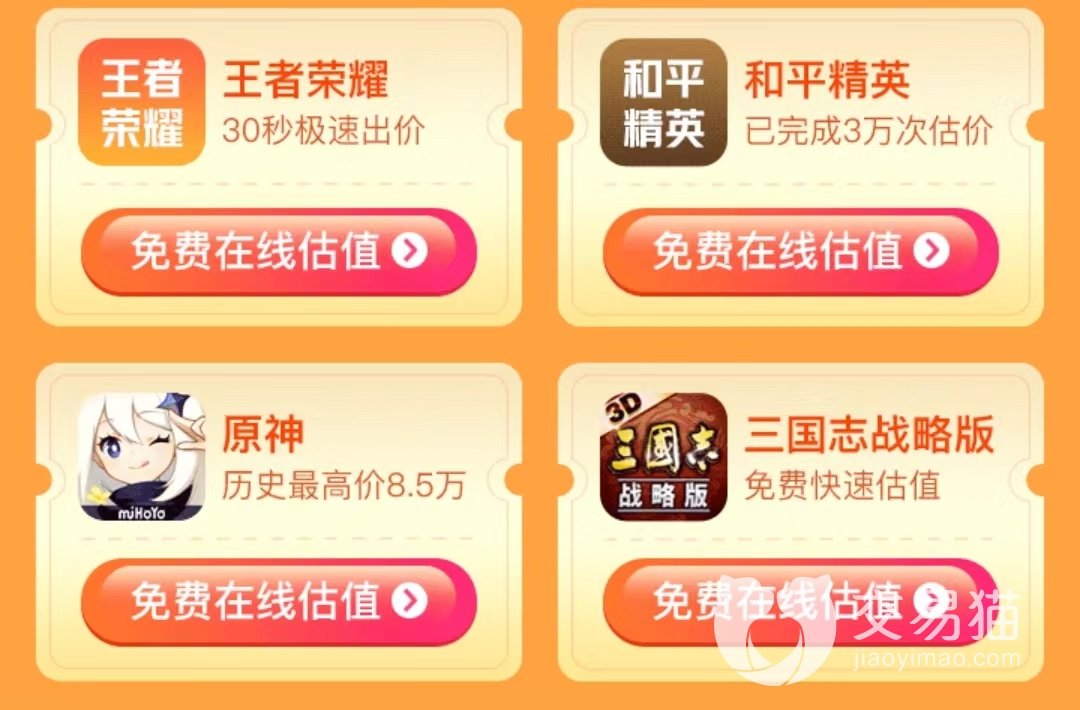 咱们想要估号小编其实非常理解,小编也是个游戏爱好者,平时也经常会去交易游戏账号,不过苦于没有一个专业的估号地方,经常会摆高了无人问津摆低了自己亏,然后小编就自己在网上寻找,终于找到一个非常不错的估号卖号交易平台交易猫。