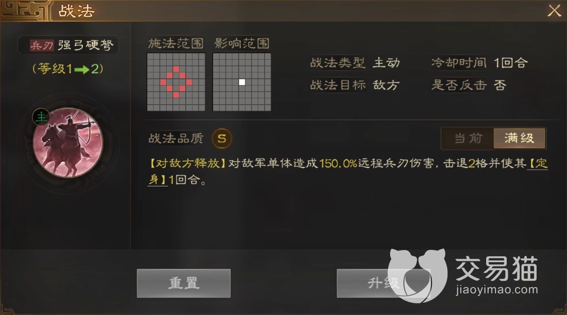这里就再来讲讲他的技能,首先要介绍的是这个游戏中每个角色本身都会携带的能力,而此角色的技能功效是可以对敌方某个人员造成较高的武力攻击,同时还可以将对方击退两步,然后对其施加定身效果。