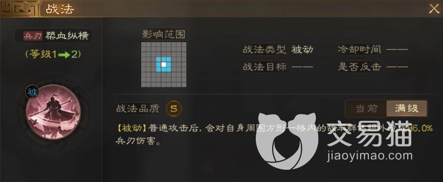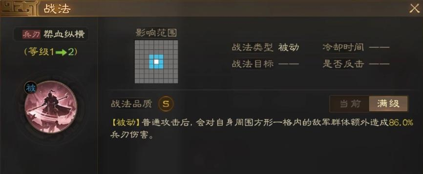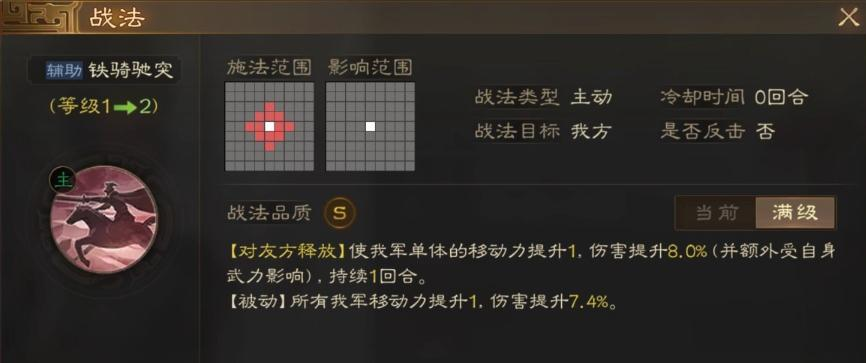 他的战法技能1铁骑驰突,可以为我方提供不错的辅助能力,四个格内的一名单位能获得速度以及伤害的加成,虽然只能持续一个回合,但是对于我方输出的提升还是巨大的.