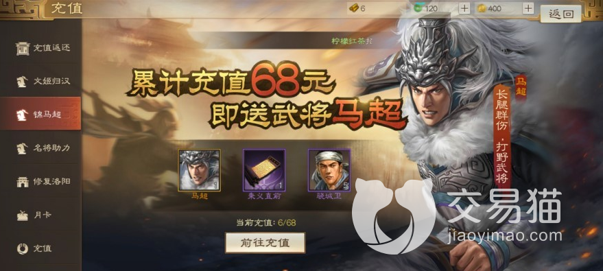 另外,玩家们也可以在活动中获取马超,在新手阶段,我们可以解锁很多任务,包括充值赢好礼任务,马超这个武将可以在充值68元的时候解锁,除了马超之外,玩家们还能获取其他的物资奖励,都是可以帮助我们更好地成长。