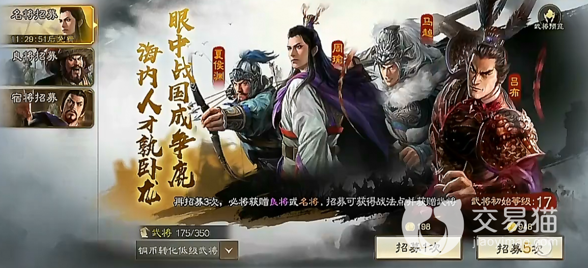 首先玩家们肯定是可以在招募卡池能获取马超的,一共会有三个卡池,其中名将卡池玩家们是可以花费金铢抽卡的,可以在3-5星武将中随机获取一个,运气好的小伙伴一发入魂也是很有可能的,而且每天都会有免费抽卡的机会,这对于平民小伙伴来说还是很实用的。