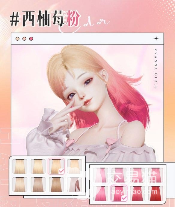 4、潮流必备草莓粉色。头顶设定为亮丽金色,发尾更改为高亮度的草莓粉色。糖果色渐变色可甜可盐,不仅能搭配甜美服饰,还能装扮炫酷造型。