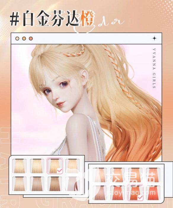 1、白金橙色渐变发。选取浅金色为主色调,发尾更改为靓丽橙色,从而形成柔和渐变。发色中间调为黄色。