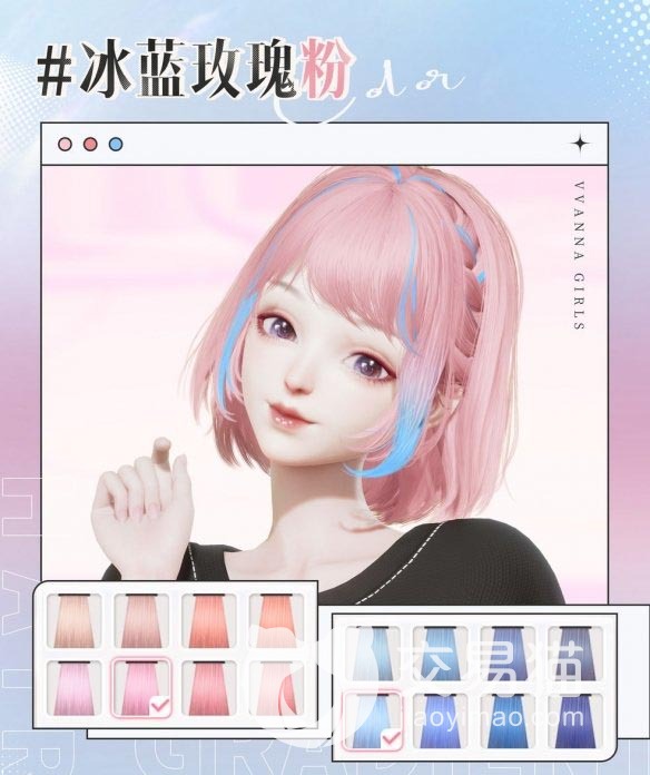 3、靓丽粉挑染明媚蓝色。角色以桃子粉为主色调,在耳侧边、额头侧边、头顶前侧等挑染几簇冰蓝色,形成强烈对比冲突感。这款渐变发非常适合夏天,清爽又不甜腻。