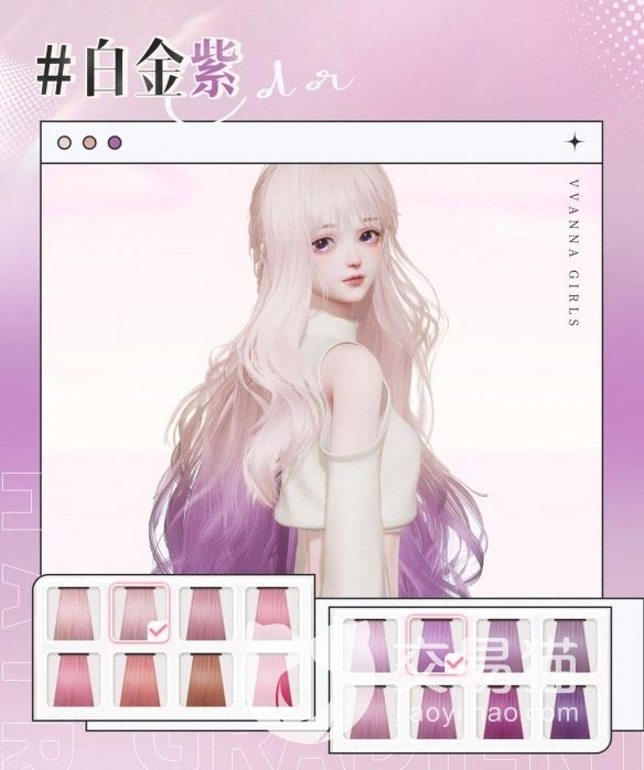 2、华丽紫色渐变色。角色头发主色调为柔美白金色,发尾更改为青春雾霾紫色,中间渐变自然过渡。