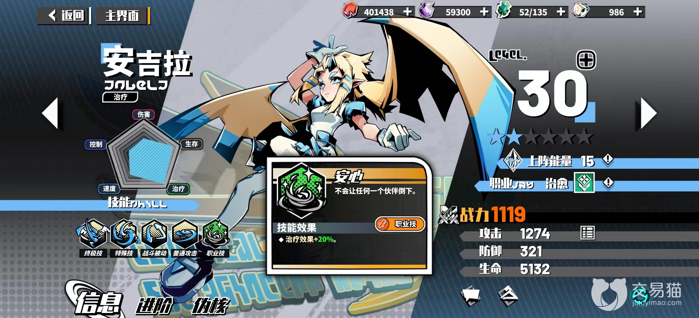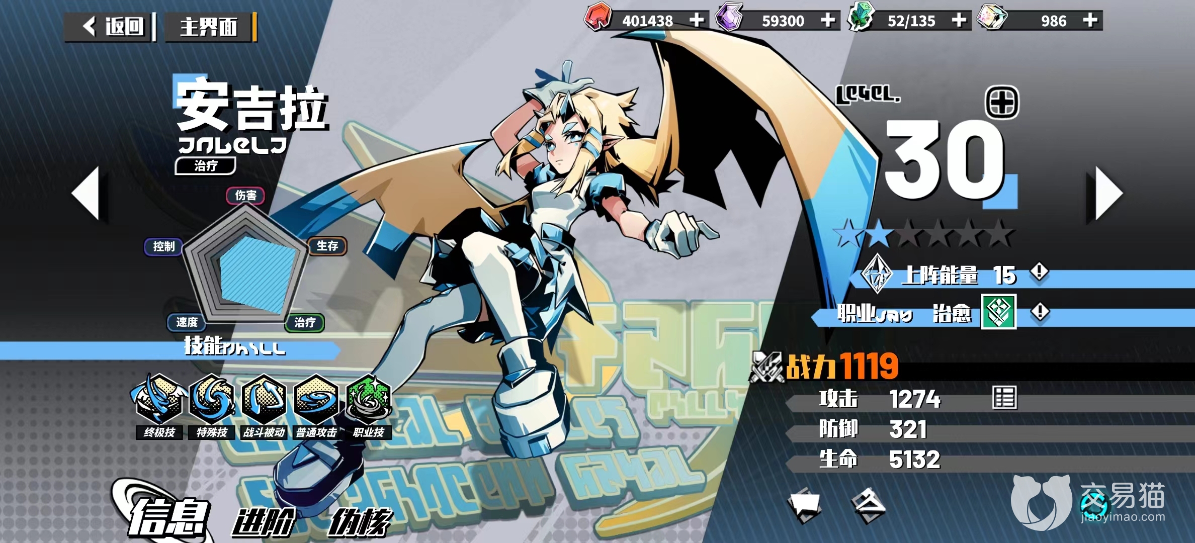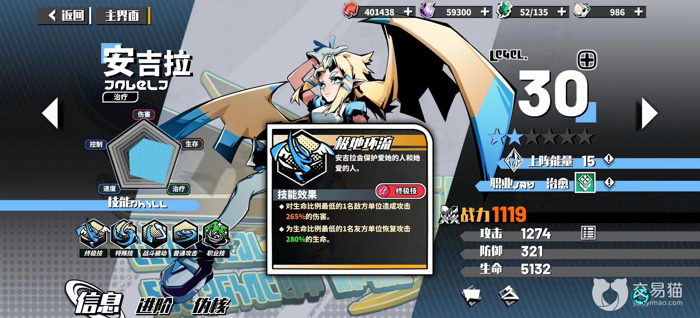 最后就是进阶方面了,安吉拉作为紫色角色,资源获取难度要低于橙色角色,这意味着安吉拉可以随时保持较高的等级,即使玩到游戏后期也不会掉队,是一个各方面非常优质的辅助类角色。
