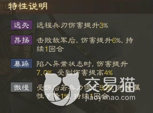 良将没有传承战法,或者说他们本身的技能就是用来传承给名将的,而作为紫将特性方面尽量有多点正向的少点负面的就不错了。曹休的特性能够提供远程增伤和击破后增伤,在被挂了debuff后伤害也会提升,但更脆皮了。