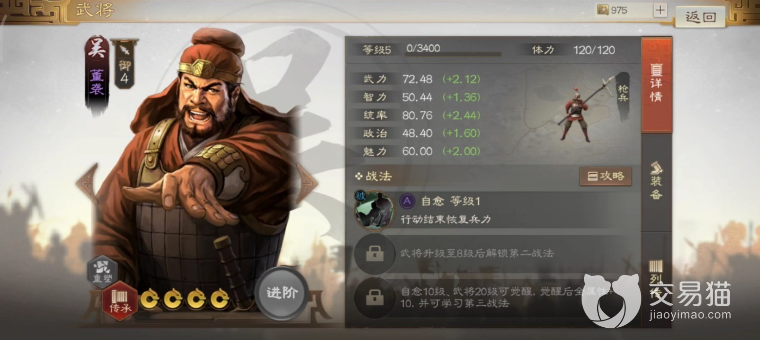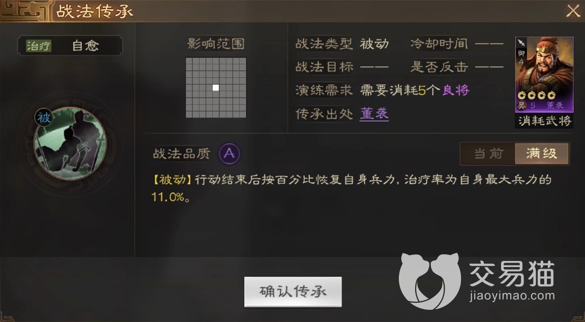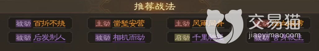 虽然说每个角色在对局里都会有自带战法和传承战法可以使用,不过此处他的这两种战法都是一样的,只不过后面那个是有演练要求的,需要使用掉五个武将才可以,另外这个能力的治疗概率是根据其自身最高血量计算的。
