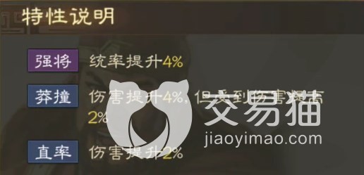 同时每个角色在对战的时候还会有不同的特性,其中的“强将”是可以为角色提高一定的统率值,“莽撞”是可以提高他的伤害,不过这里受到的伤害也会得到提升。而“直率”就是进行伤害的提升。