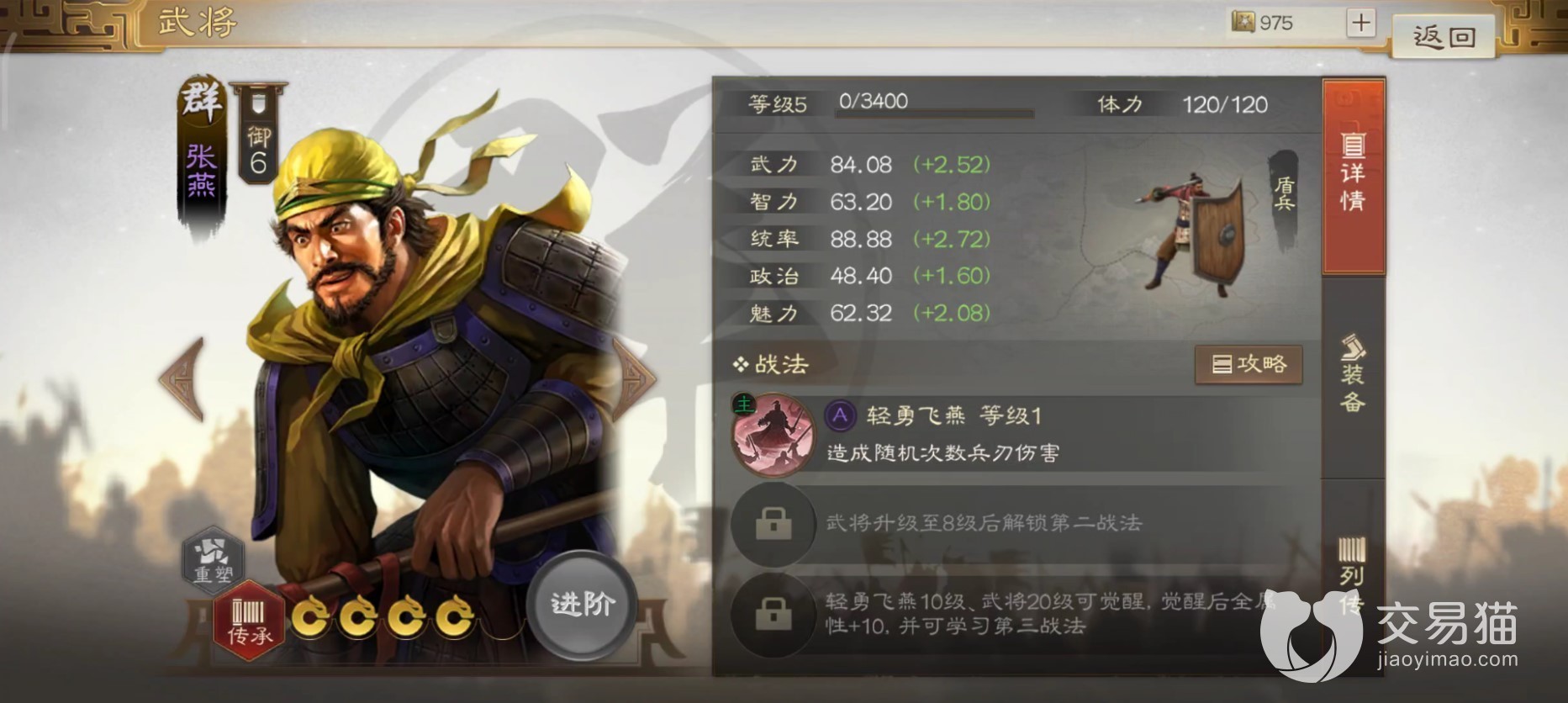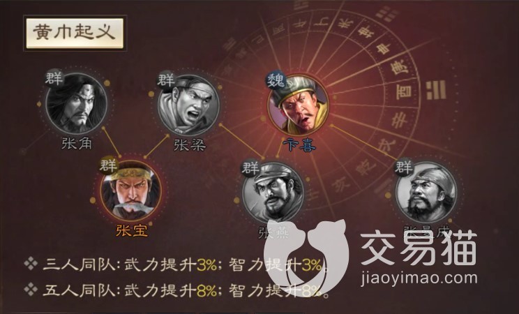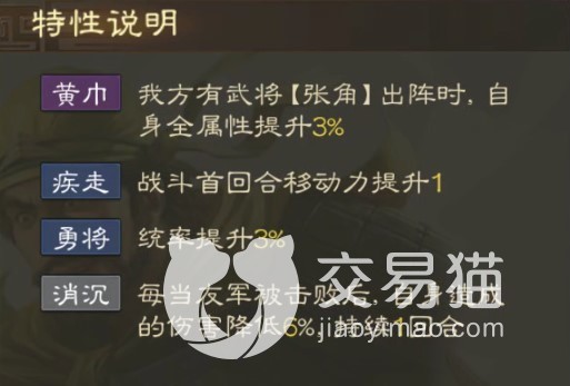 然后是特性方面,在与张角一同出战的时候,所有属性会提升3%。此外战斗的首个回合移动力会得到提升。通过特性的加持,张燕属性其实还算看得过去。而且与张角、张梁等黄巾成员组队的时候,可以得到武力、智力的提升。张角在游戏里是橙将,登场较多,所以这个组合还是有一定使用率的。