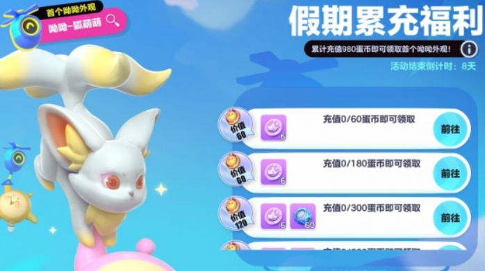 摇摇兔呦呦也是春节充值返利的奖品之一。兔呦呦没有兔子车需要充值的价格高,只需要玩玩家充值980蛋币就可以了。玩家点击充值之后就可以到充值返利热销的界面上点击领取。