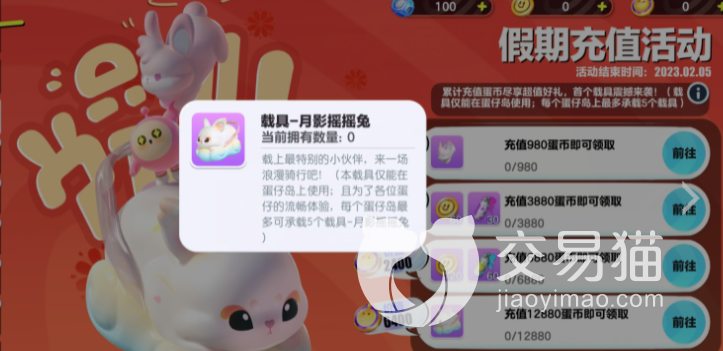 以上就是蛋仔派对月影摇摇兔的获取方法介绍了,小伙伴们现在想要获取的话已经没办法了,毕竟活动已经正式结束,但是不排除载具有返厂的可能性,因此玩家真的想要可以等到载具返厂再行购买。