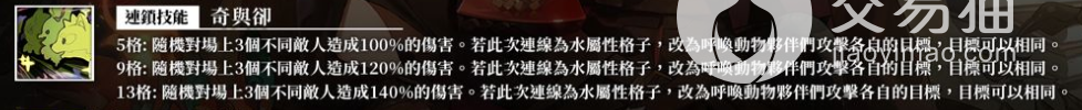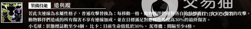 装备技能是在水属性连线下普通攻击会被替换为每移动一个格子,动物伙伴们会对各自目标发动攻击,这些攻击不会享受连线带来的伤害加成,但是会享受格子独立条件下的伤害加成,高达30%。小毛球的书法条件是敌人状态标志至少4个,比卡的触发条件是敌人生命值低于3成,泥尊鹰是目标距离间隔至少为4格,条件上不是很苛刻,所以很容易触发。