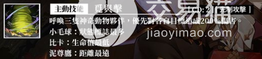 这个角色是一个新角色,所以目前只能做个前瞻,这个角色的稀有度为六星,角色形象是一个少年。主动技能可以呼唤自己的三只动物伙伴们来攻击敌人,小毛球会优先攻击状态标志最多的敌人,比卡会攻击生命值最低的敌人,泥尊鹰则会攻击距离最远的敌人,等于是召唤了三个炮台。