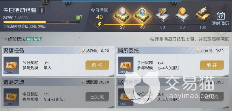 同时还有一些限时的活动能给角色带来积分提升。当玩家的活动度达到一定的时候,就会有一个宝箱,里面有大量的生存信息。生还者每天可以累积100个活动点数。只要玩家每天能完成以上四项,就能得到80个积分。其余20个点数的活动很容易。比如,完成每日补给和限时美食,就能在十秒内突破90分。