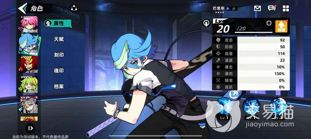 这个人物在游戏中的形象是非常严谨的少年,他在生活中很注重细节,并且对待每个人都很和善,此游中他的属性定位是水系,在这个角色五级的时候就只有二十点的攻击属性,而防御和血量值分别是十一和二十四,综合来说并不是很高。