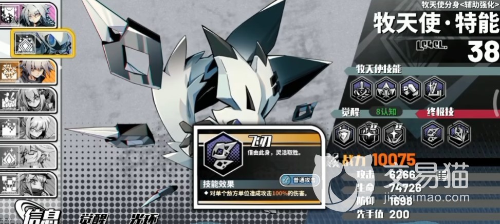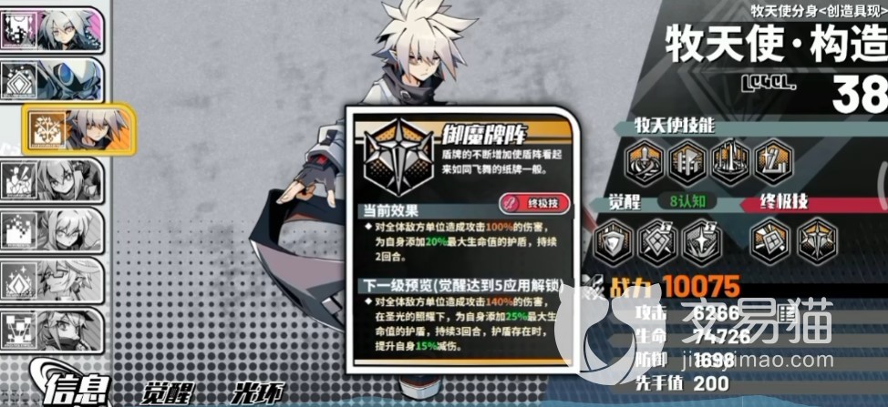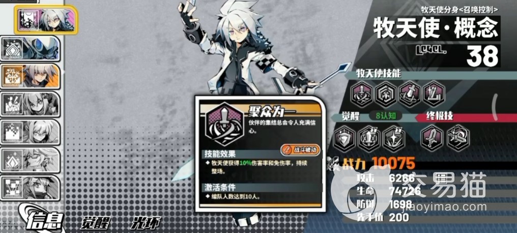 游戏中大家初始携带的是名为“概念”的牧天使,根据不同的激活条件,会有不一样的被动效果,例如有5张橙卡可以激活强者特权,让牧天使和角色都获得15%的攻击率、防御率、最大生命值提升。除了这些基础被动技能外,还有觉醒技能,这个一般是区别开不同天使定位的关键,例如概念是提供增伤、能量、分身。终结技则是单体和群体伤害,属于中规中矩的输出型天使。
