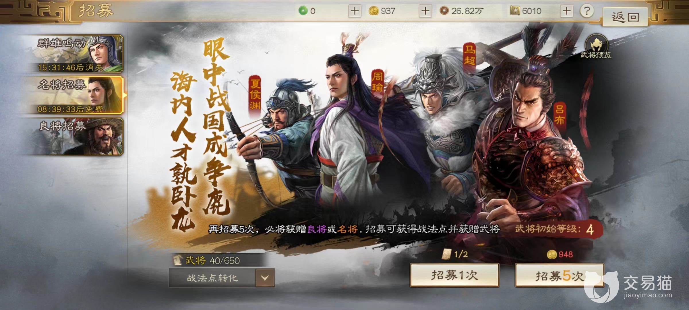 对于这样的橙色武将,最佳抽取依然是等到开启特定招募的时候,虽然依然需要消耗大量金株,但是比去基础的名将招募概率要大很多。所以在抽取武将方面小编建议就是前期可以先进行几次名将招募,这样有基础武将可以使用,如果想要招募到指定武将,依然需要等一些专属招募活动。随着游戏剧情发展以及全服玩家的共同努力,肯定会开放一些特殊招募渠道,到时再入手也不算晚。