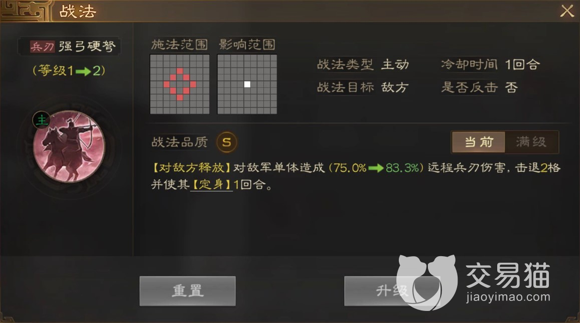 在此技能效果中,无论是定身还是击退其实都是比较有用的状态,将对方击退后,很大几率就使其脱离了攻击范围。对于骑兵武将来说,定身之后无法移动到近处也就不能进行输出,所以是一个比较考验释放水平的技能。不过伤害和自身武力确实是硬伤,这也限制了其在后期发展,很难成为真正主力核心,不过传承战法却非常好用。传承之后获得战法射人射马是一个输出非常高的单体伤害技能,还能附加定身,是很多弓兵型武将首选。