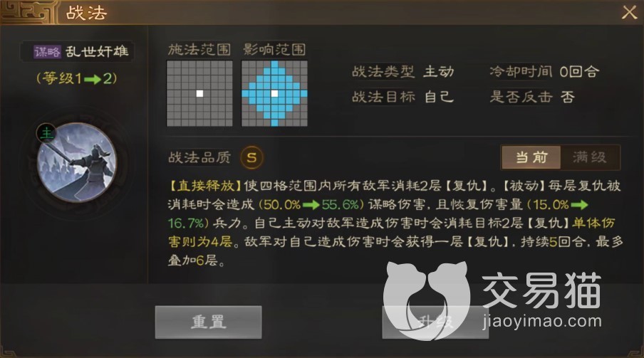 骑兵的兵种身份,搭配主动战法乱世奸雄,让曹操有着不错的单兵作战和群伤能力,乱世奸雄的效果是对周围大范围的敌军造成谋略伤害,并消耗复仇,复仇buff则是敌人在攻击自己时会叠加,造成伤害的时候还会回复兵力,所以曹操在身陷敌阵时有着更强大的战斗力,输出回复兼有。