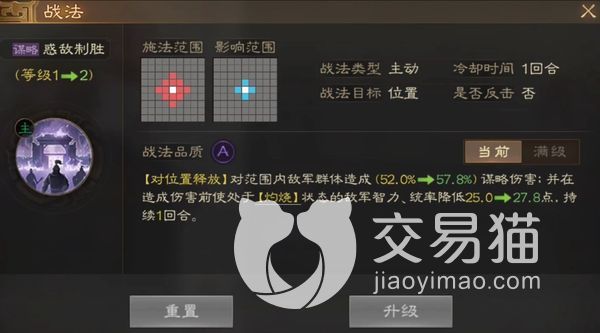 他的获敌制胜技能在一级的时候,可以对周边敌人全体都造成52%的伤害,该伤害是谋略伤害,而且还能给敌人造成灼烧伤害,影响敌人的智力统率,将其都降低25个点,而且该效果还能持续一个回合。