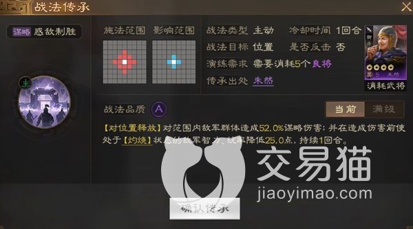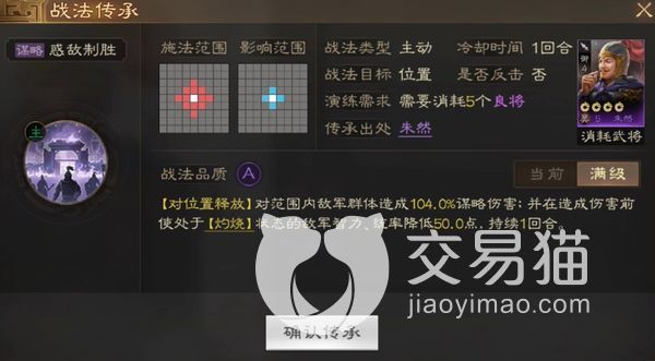 要想演练该技能效果的话,需要大家使用五个良将才能演练,它是一个A级品质的阵法,冷却时间为一个回合,总的来说技能强度也是比较不错的。
