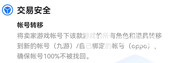 交易猫会为我们提供多种服务,在购买账号的过程中,玩家们可以选择账号转移服务,部分渠道号是可以直接进行转移的,将卖家的账号资源转移到自己的九游或者其他渠道号下面,这样后期保障也会更全面,能最大限度避免账号被找回的风险。