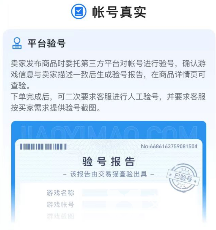 3、说到账号真实性的问题,这对于只打算购买高级游戏号的玩家来说非常关键,没人愿意花钱去获得一些虚假游戏号,所以平台也开通了针对性的验号服务。部分经过平台审核的商品,真实性各位基本不用担心,放心去交易就行。