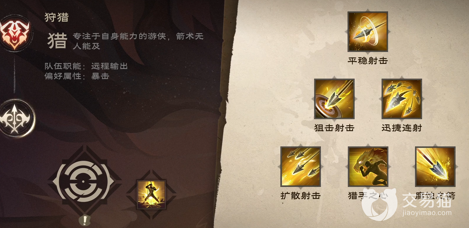 游侠的技能都有暴击属性加成,也都和箭术有关系,其核心输出技能为狙击射击和腐蚀之间,这也是游侠在boss战中的主要输出来源,游侠的平a叫做平稳射击,另外游侠还有两个aoe技能和一个被动技能,两个aoe技能主要用于清小怪,在boss战中用处不大,猎手之心比较关键,这个被动可以提升暴击并且还会提高移速,开启后配合两个单体爆发可以打出成吨的伤害。