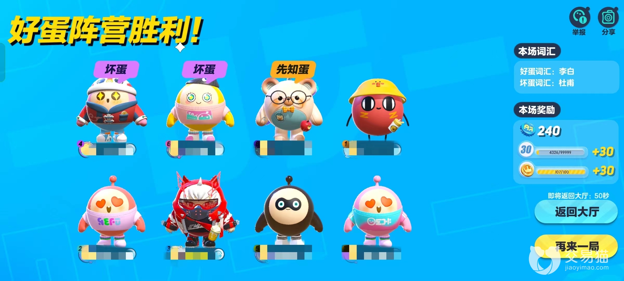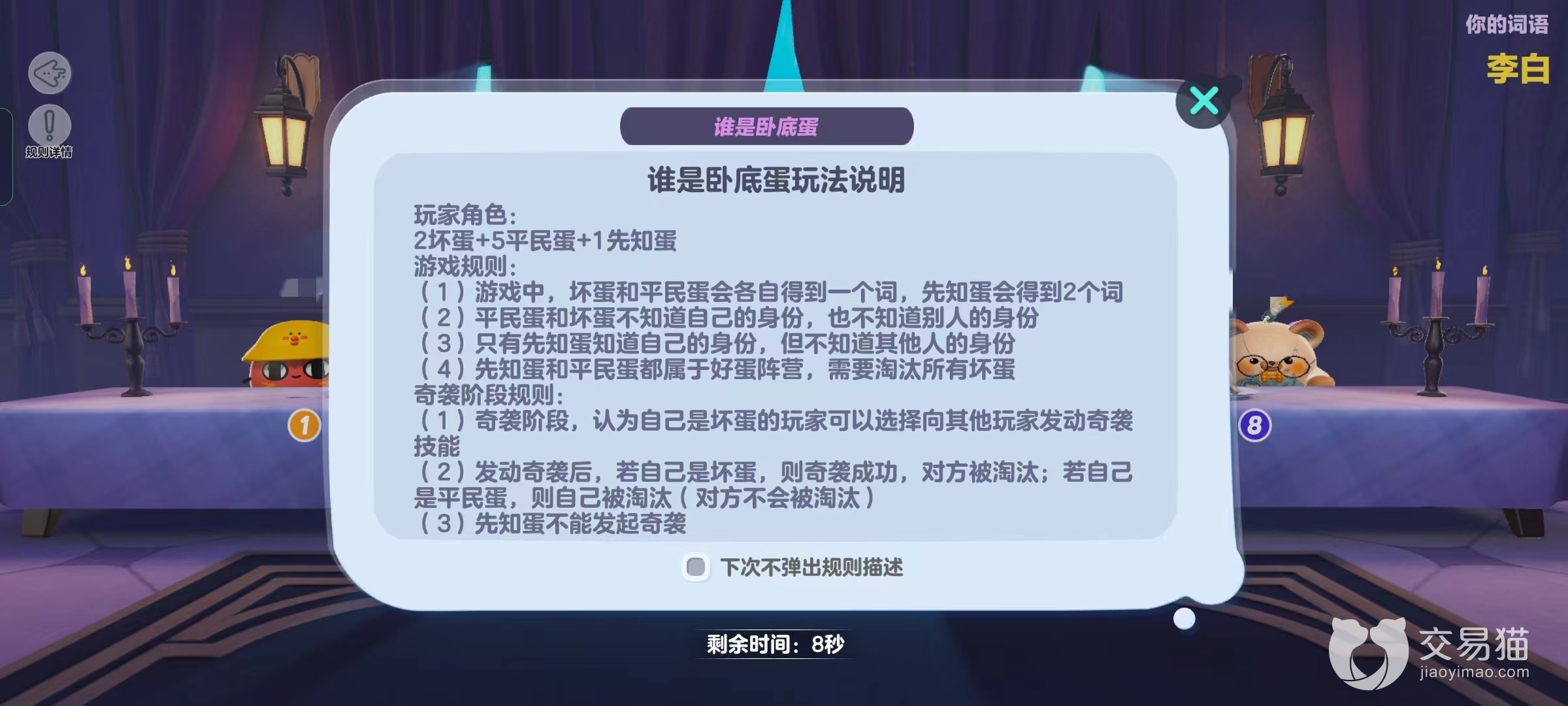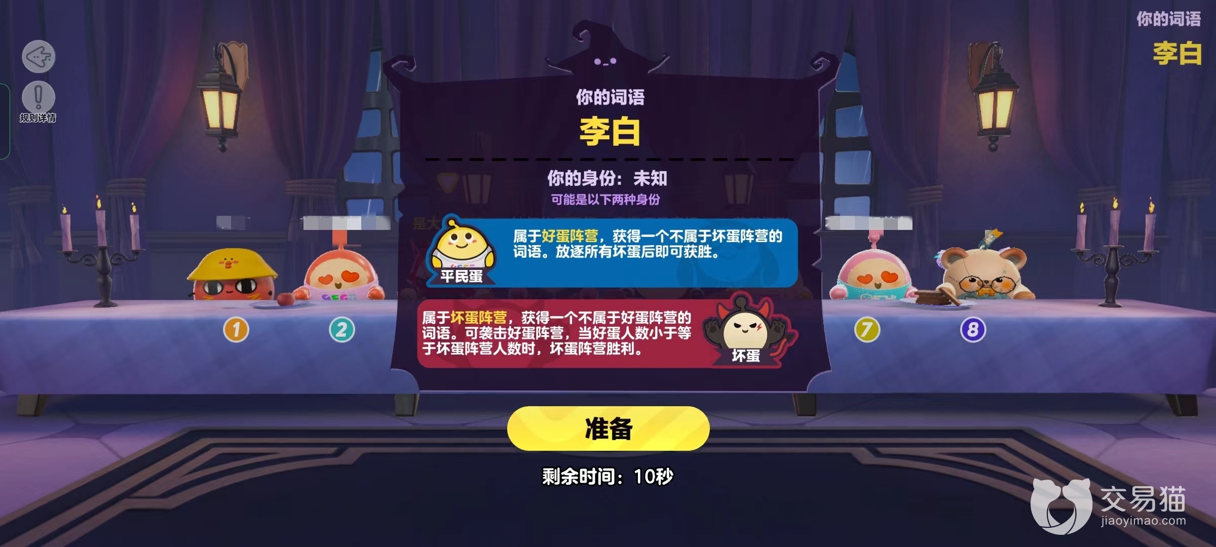 在谁是卧底蛋玩法当中,玩家进入游戏匹配成功后,八人一组会出现三个不同的角色,分别是好蛋,坏蛋以及先知蛋。好蛋和坏蛋会各拿到一个词语,先知蛋会知道坏蛋的词语是什么。