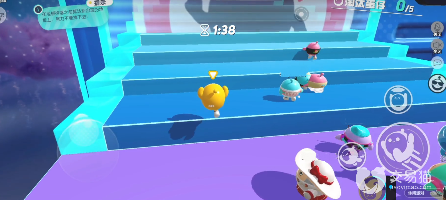 玩家会依次通过楼梯,跨越障碍以及会移动的电击瓶等最终到达终点,应为这一关的主体并不是想让玩家们竞速闯关,而是在不知不觉中淘汰没有跟上的玩家,最后剩下来的蛋仔获得胜利。