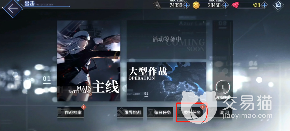 而且有的时候每日任务中会出现好几个红钻委托,这些委托的生成其实是可以人为干涉的,最简单的方法就是前往“出击”页面中的大世界板块,在该板块中你可以自由选择海域进行挑战,这里推荐大家选择安全海域的侵蚀1进行挑战,它可以使你的每日任务产生变化,多刷几次有很大机会刷出红钻任务!