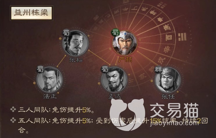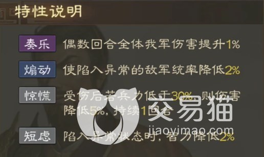 此外其特性也能带来不错的增益,偶数回合可以让全体友军增伤1%,对付debuff状态的敌人还能降低其2%的统率值。而且与法正、张松、严颜、张任一同出战的时候,还可以获得更进一步的免伤提升,而且受伤后可以得到15%的统率提升。