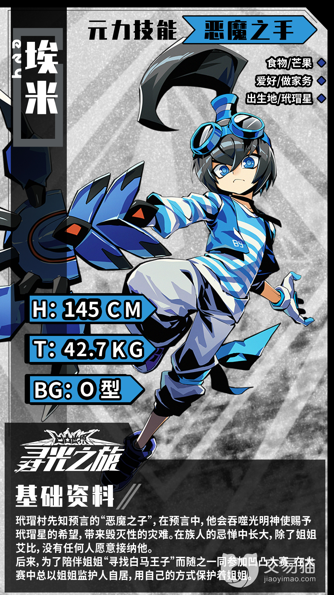 埃米是玳瑁村中被预言的恶魔的子嗣,据说在以后会吞噬掉整个村子的未来,从小就不受人待见,除了姐姐艾比可以不差别对待,而且还很保护他。