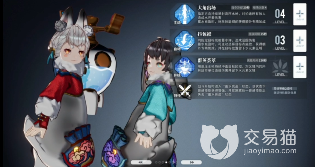 这两个角色还有三种技能,分别是主动的“大角出场”,主要的作用就是向指定位置发射高压水枪,对沿途的敌人造成水系伤害,在被动叠满的时候,释放技能还会有额外的专精加成可以获取。