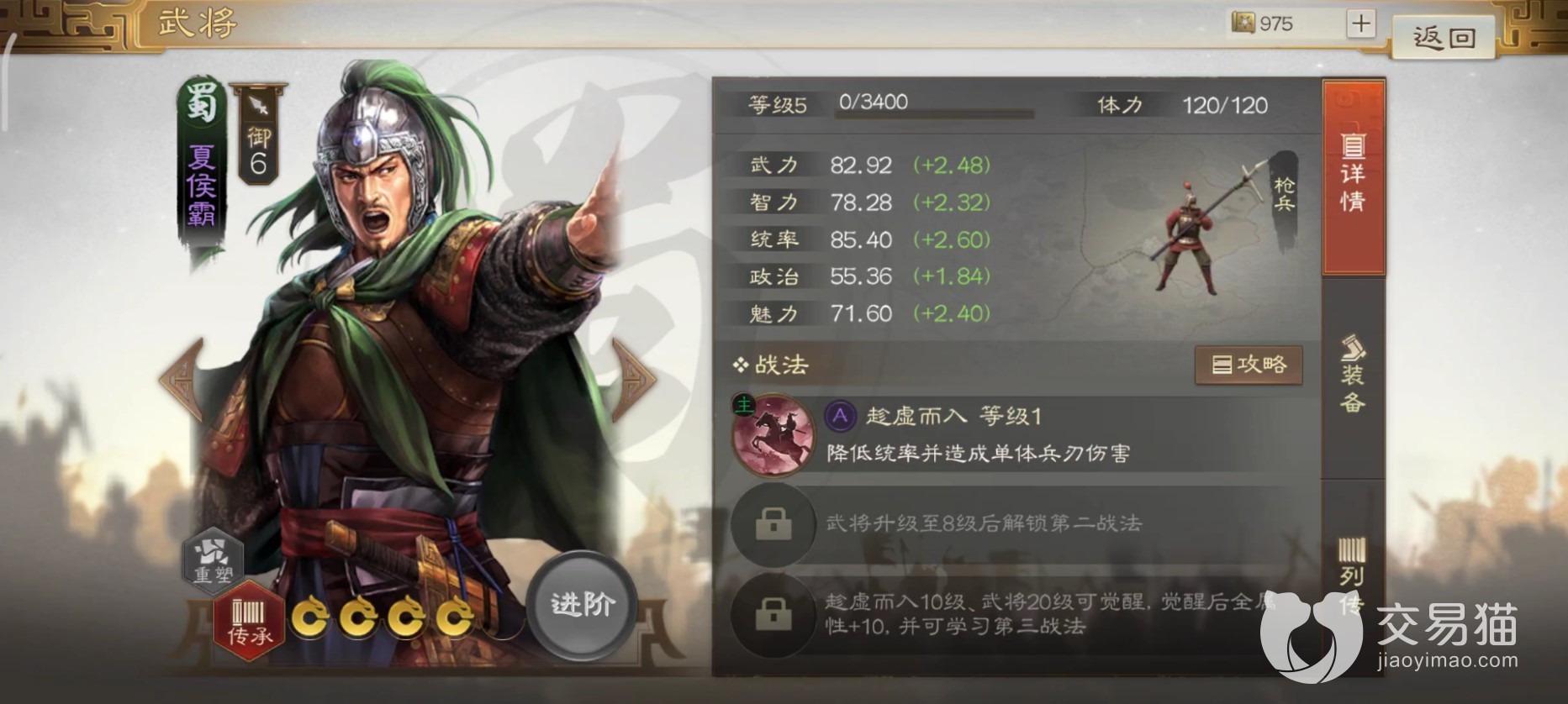 游戏里夏侯霸统率枪兵,各项属性都还算不错,尤其是武力和统率值都有80+。自带主动战法都降低敌人的统率值并对其造成兵刃伤害,最高能降低40点,能有效降低对方的血线。
